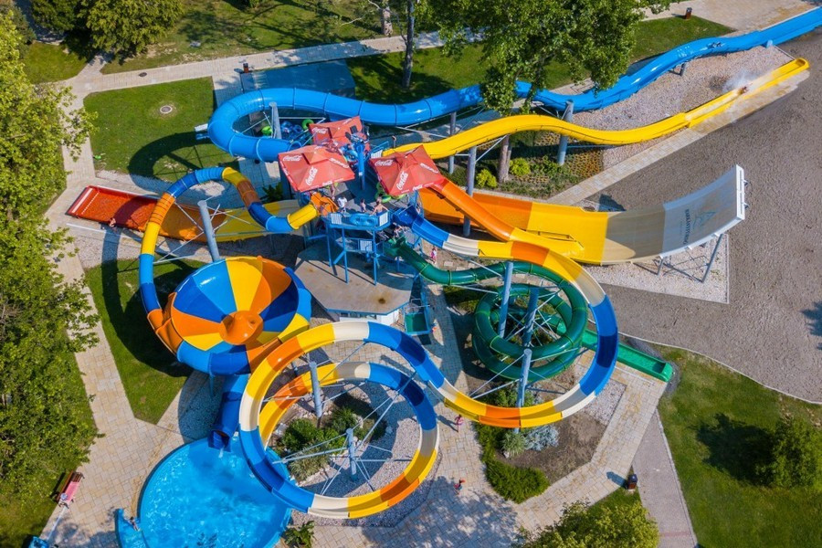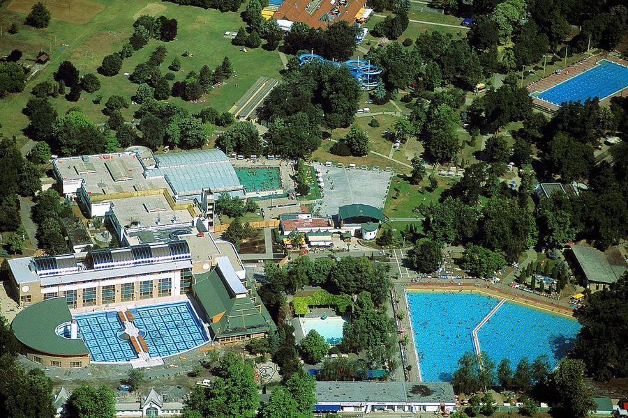 • Kompleks basenów zewnętrznych (sportowy 1050 m², terapeutyczny 1520 m², dziecięcy 220 m²)