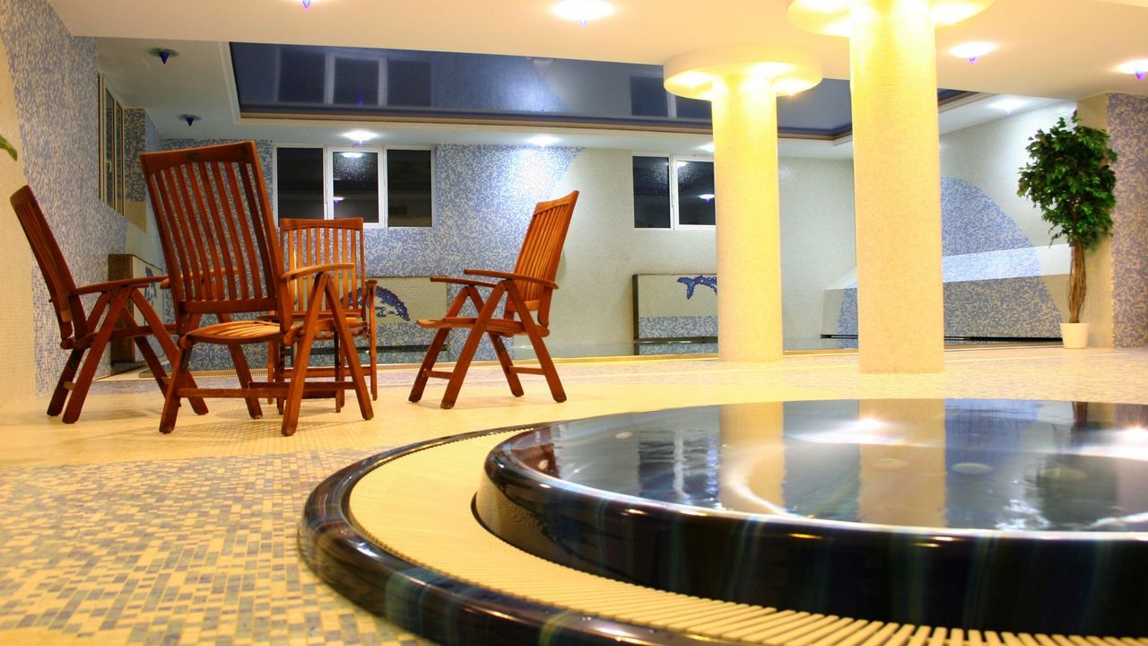 - Kryty basen ze stali nierdzewnej (10×5 m, temperatura 26 °C)