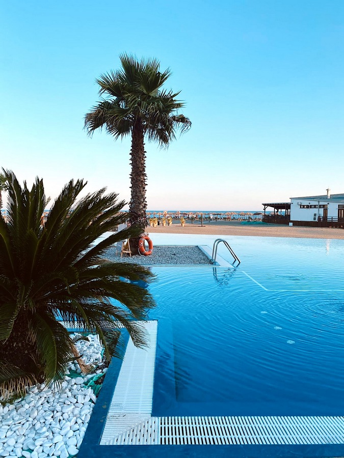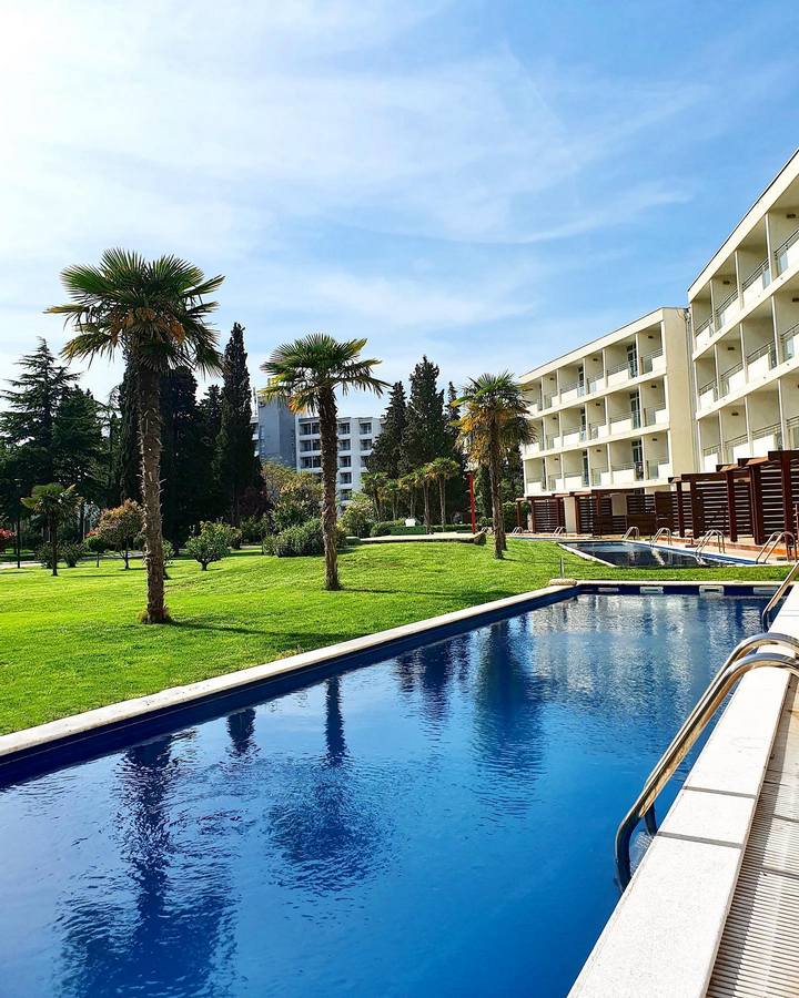 Ośrodek położony jest bezpośrednio przy długiej plaży, która jest częścią Riwiery Ulcinj – malowniczego regionu na południu Czarnogóry, niedaleko granicy z Albanią. Historyczne centrum Ulcinja oddalone jest o około 5 km. Hotel dysponuje rozległym kompleksem basenowym, a w pobliżu znajduje się również aquapark (płatny, nienależący do hotelu). Goście mogą zatrzymać się w nowoczesnych pokojach, willach lub apartamentach typu swim-up z bezpośrednim dostępem do basenu. Ośrodek oferuje kilka doskonałych restauracji i barów (niektóre na zadaszonych tarasach z bezpośrednim widokiem na morze). Hotel oferuje również zaplecze sportowe (piłka nożna, tenis, siatkówka, siłownia na świeżym powietrzu), programy animacyjne dla dzieci i dorosłych, salę gier i park linowy.