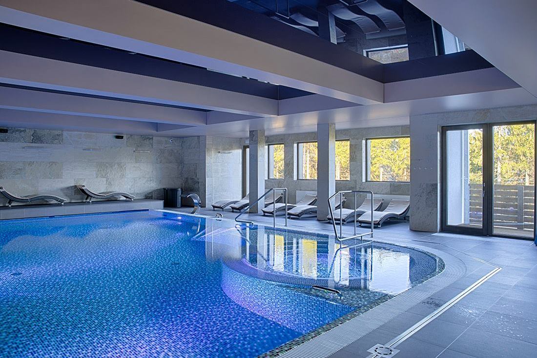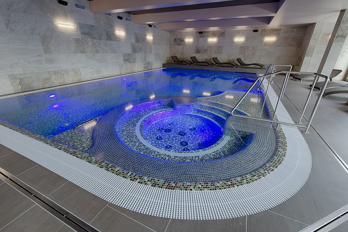 - Kryty, podgrzewany basen z dyszami masującymi (12 x 6 m)