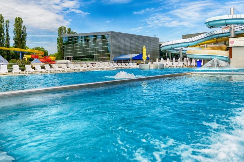 - Odkryty relaksujący basen termalny z dyszami (25×17 m)