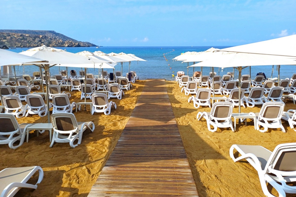 - Piaszczysta plaża (Golden Bay) z leżakami i parasolami